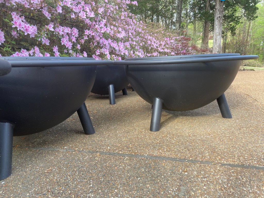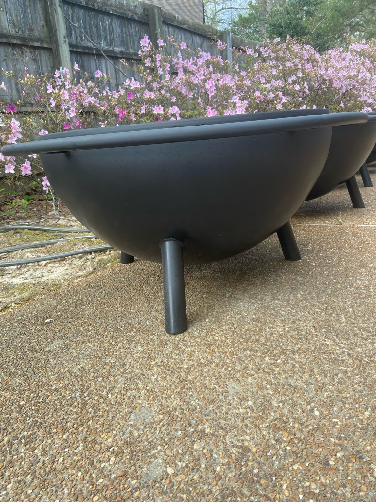 Our fire pits come in different sizes and with a built in safety handrail. The bottom of our pits are manufactured with triangular shaped holes that create a vortex for optimum draw for a longer burn with minimal stoking. Our pits are constructed from solid steel and are painted with a 1,400 degree high heat paint. Our 30 inch fire pits are 3/16th to 1/4 inch thick and our 37 inch fire pits are from 5/16th to 3/8 inch thick. We also carry portable fire rings. These are great to take camping and easy to move around your yard.